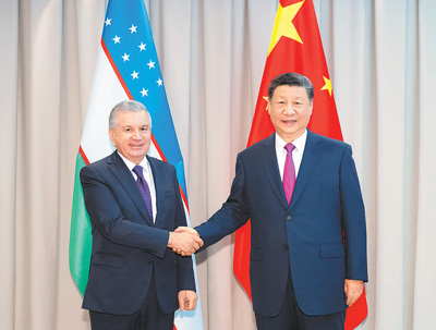 习近平指出,今年1月,你对中国成功进行国事访问,我们一致决定将中乌关系提升为新时代全天候全面战略伙伴关系,在更高起点上构建中乌命运共同体,两国关系发展进入了新阶段。今年是中华人民共和国成立75周年。中国正在加快推进中国式现代化,乌兹别克斯坦也在全面推进“乌兹别克斯坦—2030”战略。我们的目标很宏伟,也很朴素,就是让人民过上更好的日子。中方愿同乌方一道,以国家命运为怀、以人民福祉为念,推动中乌关系高质量发展。