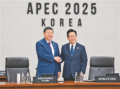 当地时间11月1日上午,国家主席习近平出席亚太经合组织第三十二次领导人非正式会议东道主交接环节,宣布中方将于明年11月在广东省深圳市举办亚太经合组织第三十三次领导人非正式会议。这是习近平同韩国总统李在明在交接环节上握手。  |
