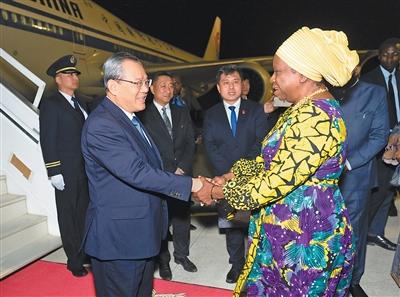 赞比亚副总统纳卢曼戈和中国驻赞比亚大使韩镜到机场迎接。